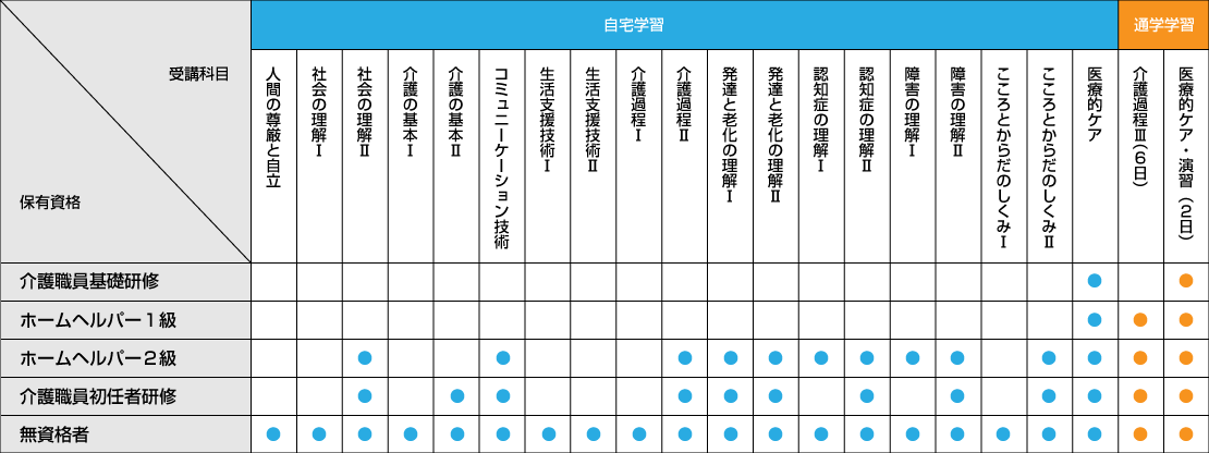 お持ちの資格によって、受講が免除になる科目があります。(●・・・受講科目)